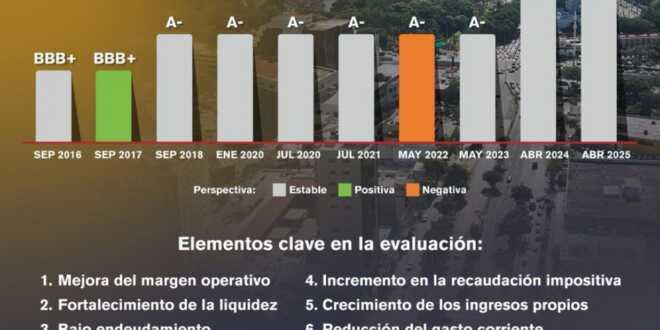 La calificación también destacó el aumento sostenido en la recaudación de ingresos propios, en particular los impuestos municipales, que representaron en 2024 el 11.6% de los ingresos operativos, la cifra más alta registrada en el periodo analizado.
