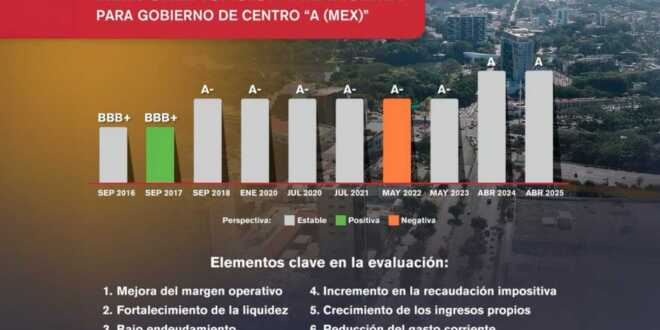 La agencia internacional Fitch Ratings ratificó este mes de abril la calificación “A (mex)” para el municipio de Centro, la más alta obtenida desde que comenzó a evaluarse el desempeño financiero del Ayuntamiento en 2005.
