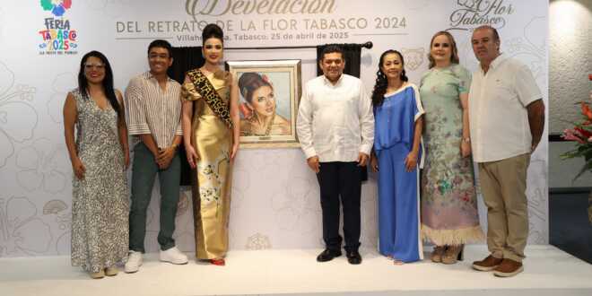 Explicó que el retrato de la Flor Tabasco 2024 es obra del artista Heberto Méndez Pérez, arquitecto egresado de la Universidad Autónoma de Guadalajara, quien desde el 2014 retrata a las ganadoras del certamen estatal Flor Tabasco.