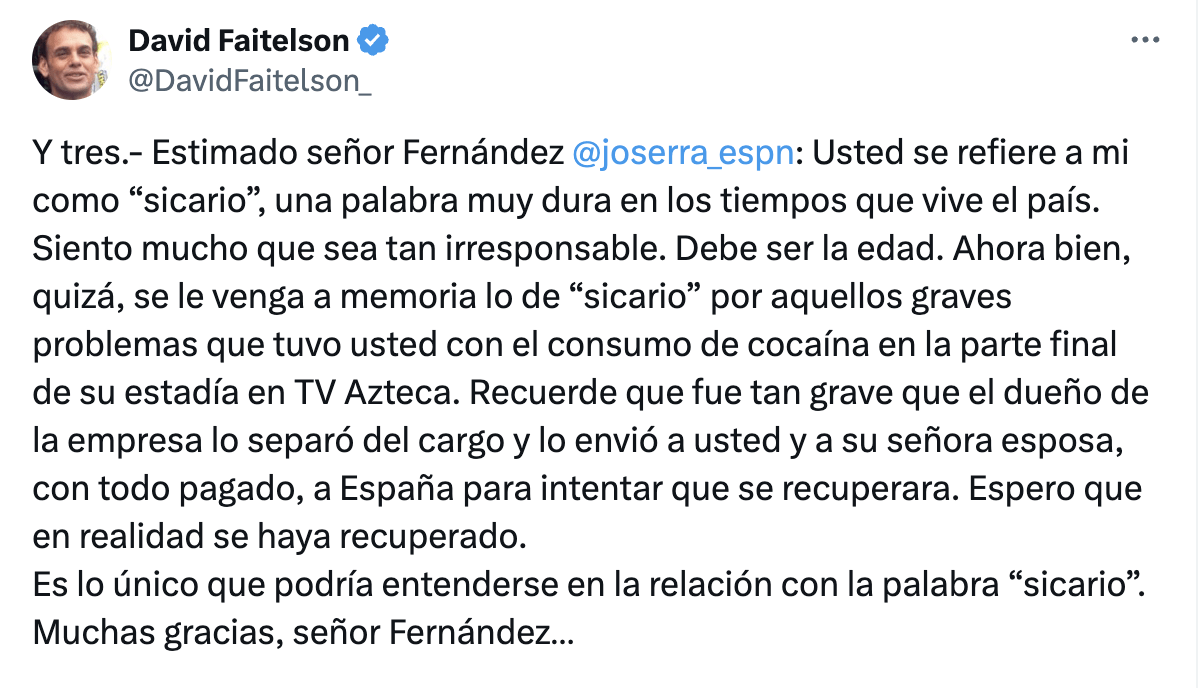 La disputa entre los periodistas deportivos David Faitelson y José Ramón Fernández alcanzó un nuevo nivel de tensión tras una grave acusación hecha por Faitelson, quien afirmó que su excompañero enfrentó “graves problemas” con la cocaína durante su etapa final en TV Azteca.