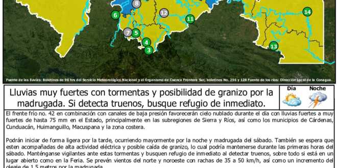 El frente frío no. 42 en combinación con canales de baja presión favorecerán cielo nublado durante el día con lluvias fuertes a muy fuertes de hasta 75 mm en el Estado, principalmente en las subregiones de Sierra y Ríos, así como los municipios de Cárdenas, Cunduacán, Huimanguillo, Macuspana y la zona costera.