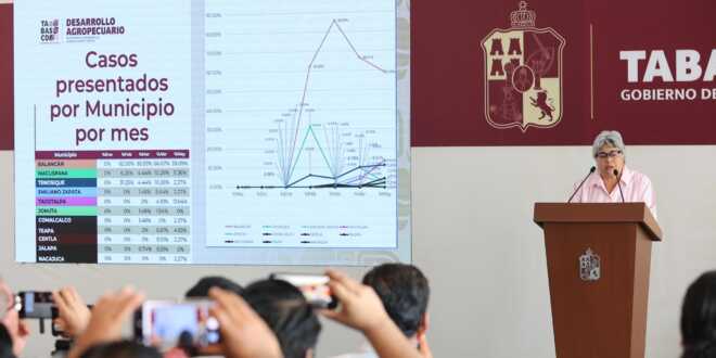 De acuerdo con Senasica, único organismo avalado para confirmar casos, con corte al 15 de mayo, en México se han reportado 1 mil 494 infestaciones. De estos, 59% corresponden a Chiapas, con 879 animales afectados; 26% a Tabasco, con 390 registros; 11.98% a Campeche, con 179; y 2.21% a Quintana Roo, con 33 casos. En el panorama estatal, los municipios con reportes de miasis, provocada por el parásito cochliomyia hominivorax, son Balancán, Macuspana, Tenosique, Emiliano Zapata, Tacotalpa, Jonuta, Teapa, Centla, Jalapa y Nacajuca.
