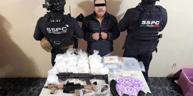 Resultado de trabajos de inteligencia e investigación, en una acción encabezada por elementos de la Secretaría de Seguridad y Protección Ciudadana (SSPC), junto con Secretaría de la Defensa Nacional (Defensa), Secretaría de Marina (Semar), Fiscalía General de la República (FGR) y Guardia Nacional (GN), además de la Fiscalía General del Estado (FGE) de Baja California, tras ejecutar una orden de cateo se detuvo a un hombre con armas de fuego, droga, cartuchos y dos vehículos.