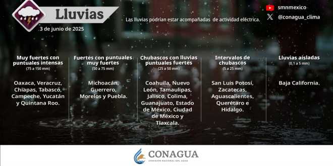 Hoy, martes, se estiman lluvias puntuales intensas (de 75 a 150 milímetros [mm]) en Oaxaca, Veracruz, Chiapas, Tabasco, Campeche, Yucatán y Quintana Roo; muy fuertes (de 50 a 75 mm) en Michoacán, Guerrero, Morelos y Puebla; fuertes (de 25 a 50 mm): Coahuila, Nuevo León, Tamaulipas, Jalisco, Colima, Guanajuato, Estado de México, Ciudad de México y Tlaxcala; intervalos de chubascos (de 5 a 25 mm) en San Luis Potosí, Zacatecas, Aguascalientes, Querétaro e Hidalgo, y lluvias aisladas (de 0.1 a 5 mm) en Baja California.