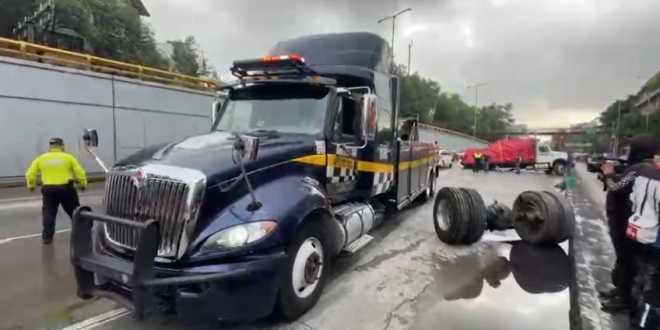 A un camión tipo tortón se le desprendió el eje trasero después de pegar con la aguja de incorporación del Circuito Interior a la altura de la calle de Río de la plata. El camión procedente de Toluca y que transporta más de 20 toneladas de madera, quedó atravesado sobre circuito interior en dirección a la Avenida de los Insurgentes después que el conductor no calculara bien la distancia.