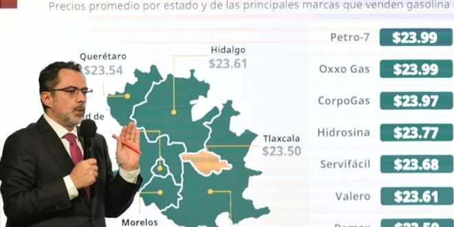 Durante la Mañanera del pueblo de este lunes, el procurador detalló que en los estados del centro de la República Mexicana, como Querétaro, Hidalgo, Ciudad de México, Estado de México, Morelos, Puebla y Tlaxcala, el litro de gasolina regular se vende entre los 23.50 y 23.78 pesos.