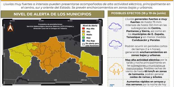 Villahermosa, Tab. 18 de junio de 2025.- El Sistema de Alerta Temprana de Tabasco ha emitido un aviso por la alta probabilidad de lluvias muy fuertes a intensas durante las próximas 48 horas, como resultado de la interacción de varios sistemas atmosféricos. Las lluvias podrían estar acompañadas de tormentas eléctricas y concentrarse especialmente en las subregiones Centro, Pantanos y Sierra, así como en municipios como Emiliano Zapata, Tenosique y, en menor medida, Cunduacán y Paraíso.