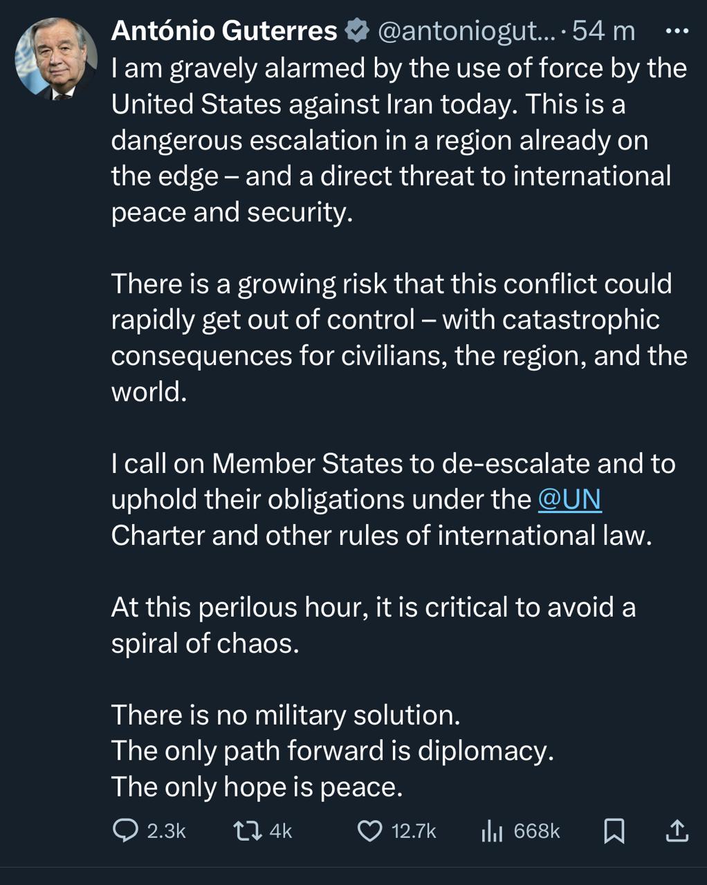 «Estoy profundamente alarmado por el uso de la fuerza por parte de Estados Unidos contra Irán hoy. Se trata de una peligrosa escalada en una región ya al límite, y una amenaza directa para la paz y la seguridad internacionales.