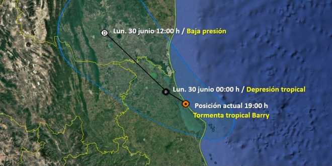 A las 19:00 horas, tiempo del centro de México, el centro de la tormenta tropical Barry impactó en el municipio de Tampico Alto, Veracruz, con vientos máximos sostenidos de 75 kilómetros por hora (km/h) y rachas de 95 km/h. Mantiene su desplazamiento hacia el oeste-noroeste a 13 km/h.