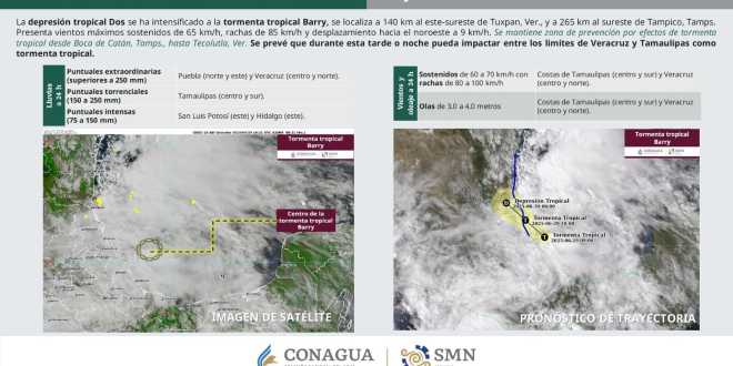 Asimismo, en el océano Atlántico, la depresión tropical Dos se intensificó a la tormenta tropical Barry, su centro se localizó a 265 km al sureste de Tampico, Tamaulipas, y a 140 km al este-sureste de Tuxpan, Veracruz, con vientos máximos sostenidos de 65 km/h, rachas de viento de 85 km/h y movimiento hacia el noroeste a 9 km/h.