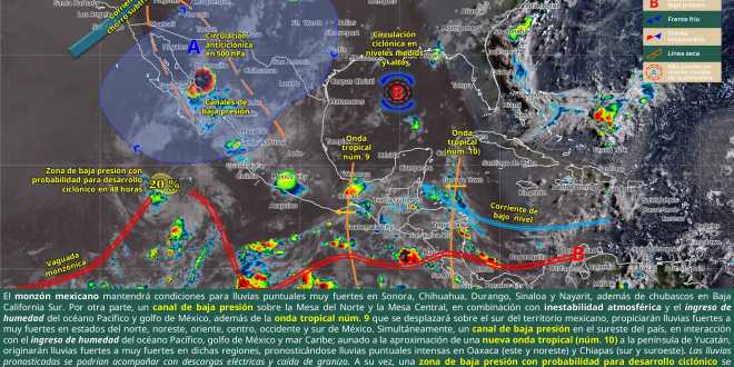 número (núm.) 9 sobre el sur del territorio mexicano, un canal de baja presión en el sureste del país, y la aproximación de una nueva onda tropical (núm. 10) a la península de Yucatán.