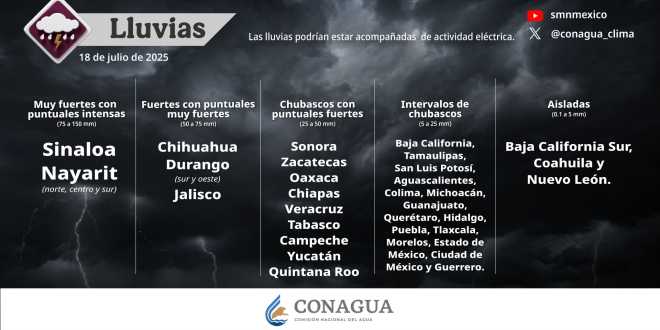 Para este día, se pronostican lluvias puntuales intensas (de 75 a 150 milímetros [mm]) en regiones de Sinaloa y Nayarit (norte y centro); muy fuertes (de 50 a 75 mm) en zonas de Chihuahua, Durango (sur y oeste) y Jalisco, así como precipitaciones fuertes (de 25