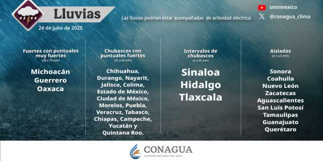 Para este jueves, se pronostican lluvias puntuales muy fuertes (de 50 a 75 milímetros [mm]) en Michoacán, Guerrero y Oaxaca; fuertes (de 25 a 50 mm) en Chihuahua, Durango, Nayarit, Jalisco, Colima, Estado de México, Ciudad de México, Morelos, Puebla,