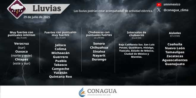 Hoy, martes, se pronostican lluvias puntuales intensas (de 75 a 150 milímetros [mm]) en regiones de Veracruz (sur), Oaxaca (norte y este) y Chiapas (este y sur); muy fuertes (de 50 a 75 mm) en zonas de Jalisco, Colima, Michoacán, Guerrero, Puebla y Tabasco,