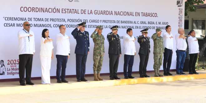 Desde las instalaciones de dicha corporación en la ciudad de Villahermosa y por disposición de la Presidenta de México y comandanta Suprema de las Fuerzas Armadas, Claudia Sheinbaum Pardo, el mandatario estatal atestiguó la toma de protesta realizada por el coordinador territorial de la GN Región Golfo, Ignacio Murillo Rodríguez y en presencia de integrantes de la Mesa para la Construcción de Paz y Seguridad.