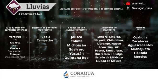 25 a 50 mm) en Jalisco, Colima, Michoacán, Guerrero, Yucatán y Quintana Roo; intervalos de chubascos (de 5 a 25 mm) en Sonora, Sinaloa, Nayarit, Chihuahua, Durango, Nuevo León, San Luis Potosí, Tamaulipas, Querétaro, Hidalgo, Estado de México y Ciudad de