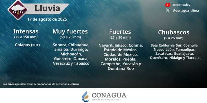En las próximas horas, se pronostican lluvias puntuales intensas (de 75 a 150 milímetros [mm]) en Chiapas (sur); muy fuertes (de 50 a 75 mm) en Sonora, Chihuahua, Sinaloa, Durango, Michoacán, Guerrero, Oaxaca, Veracruz y Tabasco; fuertes (de 25 a 50 mm) en Nayarit, Jalisco, Colima, Estado de México, Ciudad de México, Morelos, Puebla, Campeche, Yucatán y Quintana Roo; intervalos de chubascos (de 5 a 25 mm) en Baja California Sur, Coahuila, Nuevo León, Tamaulipas, Zacatecas, Guanajuato, Querétaro, Hidalgo y Tlaxcala, y lluvias aisladas (de 0.1 a 5 mm) en San Luis Potosí y Aguascalientes.