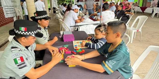 Con exhibición de equipo táctico, actividades lúdicas, y servicios de peluquería y fisioterapia, Guardia Nacional atendió a más de 900 habitantes que charlaron con los guardias en la jornada de pláticas.