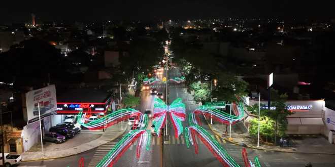 Los adornos septembrinos lucieron en la fachada del Palacio Municipal, que exhibió el Escudo Nacional y la frase ¡Viva México!, mientras que el reloj se iluminó con los tres colores patrios: verde, blanco y rojo.
