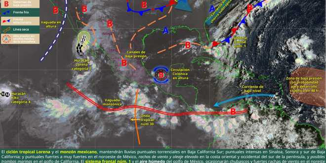 Con base en la información de las 06:00 horas, tiempo del centro de México, el huracán Lorena, categoría 1 en la escala Saffir-Simpson, se localizó a 180 kilómetros (km) al oestesuroeste de Cabo San Lázaro y a 430 km al sur de Punta Eugenia, ambas localidades de Baja