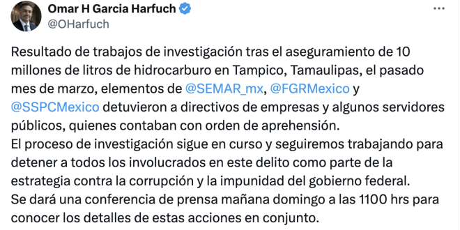 En operaciones coordinadas realizadas en días recientes como resultado de trabajos de investigación, elementos de la Secretaría de Marina (Semar), Fiscalía General de la República (FGR) y Secretaría de Seguridad y Protección Ciudadana (SSPC) llevaron a cabo diversas órdenes de aprehensión en contra de personas relacionadas con el mercado ilícito de combustibles (MIC), dentro de los cuales se encuentran empresarios y servidores públicos.