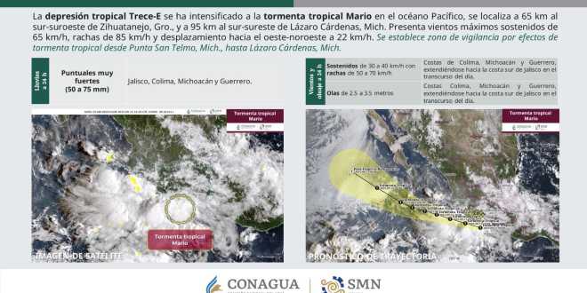 Con base en la información de las 09:00 horas, tiempo del centro de México, la depresión tropical Trece-E se intensificó a la tormenta tropical Mario, en el océano Pacífico. Se localizó a 65 kilómetros (km) al sur-suroeste de Zihuatanejo, Guerrero, y a 95 km al sur-sureste de Lázaro Cárdenas, Michoacán, con vientos máximos sostenidos de 65 kilómetros por hora (km/h), rachas de 85 km/h y desplazamiento hacia el oeste-noroeste a 22 km/h.
