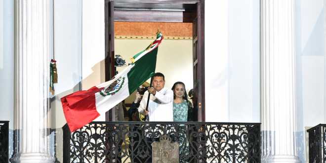 Junto a la presidenta honoraria del Sistema DIF Tabasco, Aurora Raleigh de la Cruz, así como representantes de los poderes de la entidad y las fuerzas armadas, el mandatario rindió honores a la enseña nacional, y desde el balcón principal del Palacio de Gobierno tocó la campana con la que se conmemoró el 215 aniversario del inicio del Movimiento de Independencia.