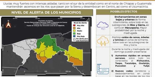 En el caso del Usumacinta, se prevé que alcance o incluso supere su límite máximo ordinario. Protección Civil exhortó a la población a mantenerse informada y tomar precauciones en zonas ribereñas y bajas.