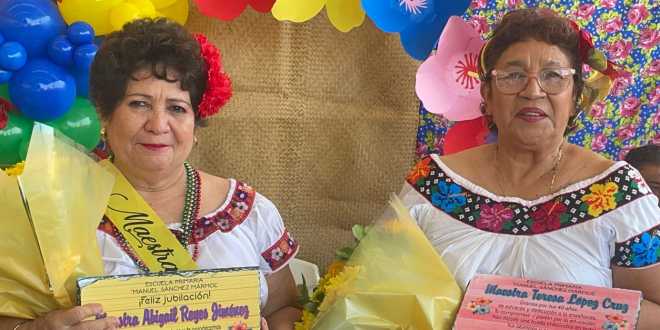 Alumnos, maestros y padres de familia de la escuela primaria Manuel Sánchez Mármol despidieron este día por motivos de su jubilación a las profesoras Teresa López Cruz (docente de 40 años de servicio) y Abigail Reyes Jiménez (docente de educación especial con 33 años de servicio), en un emotivo homenaje los alumnos se despidieron de sus maestras.