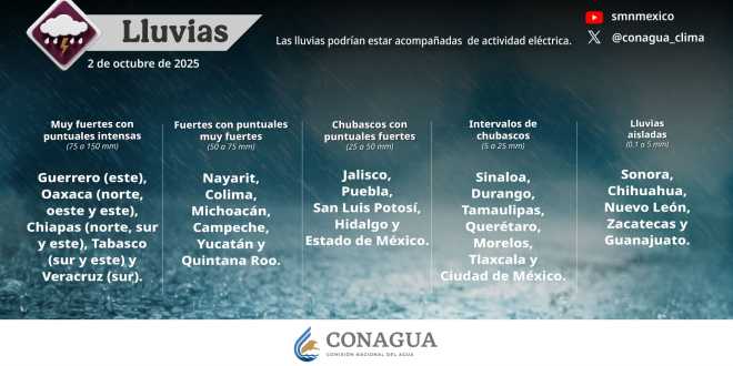 Para hoy, se pronostican lluvias puntuales intensas (de 75 a 150 milímetros [mm]) en regiones de Guerrero (este), Oaxaca (norte, oeste y este), Chiapas (norte, sur y este), Tabasco (sur y este) y Veracruz (sur); muy fuertes (de 50 a 75 mm) en zonas de Nayarit,