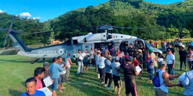 Mediante el apoyo de tres aeronaves, se efectúa el traslado de víveres y material de emergencia, para distribuir despensas y agua embotellada en las zonas más afectadas y de difícil acceso por las intensas lluvias.