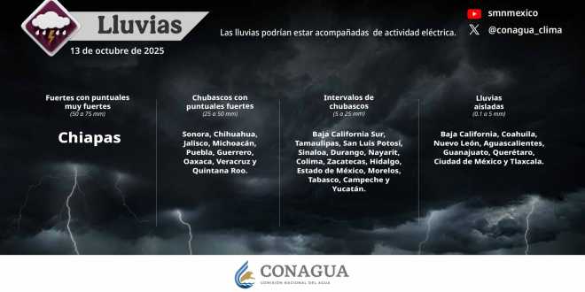 En las próximas horas, se pronostican lluvias muy fuertes (de 50 a 75 milímetros [mm]) en Chiapas; fuertes (de 25 a 50 mm) en Sonora, Chihuahua, Jalisco, Michoacán, Puebla, Guerrero, Oaxaca, Veracruz y Quintana Roo; intervalos de chubascos (de 5 a 25 mm) en