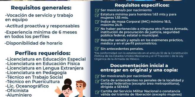 “Algo muy importante es que no deben haber formado parte de la policía municipal o estatal, la Guardia Nacional, es decir, en ninguna corporación policiaca. Es una gran oportunidad porque va estar allí todo el personal de la Marina, entrevistando, recibiendo documentación, revisándola, midiendo la estatura, realizando exámenes médicos”, señaló Zarrabal Rabelo.