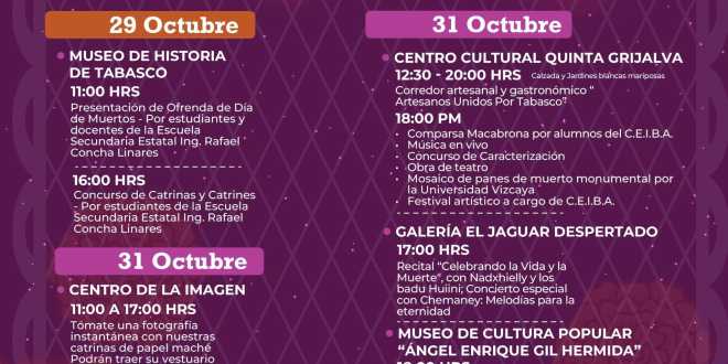 • En el Centro Cultural Quinta Grijalva, se desarrollará el corredor artesanal y gastronómico “Artesanos Unidos por Tabasco”, acompañado de música en vivo, la comparsa Macabrona y el mosaico gigante de panes de muerto realizado por la Universidad Vizcaya.