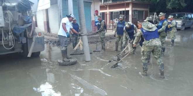 Realizan trabajos de limpieza de las calles con 2 camiones vactor, 7 retroexcavadoras, 4 volteos de 14 metros cúbicos y una 1 pipa, en coordinación con la Secretaría de la Defensa Nacional (DEFENSA) y la Secretaría de Marina (SEMAR).