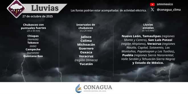 Las precipitaciones pueden ser con descargas eléctricas y caída de granizo. Las lluvias fuertes a intensas pueden ocasionar inundaciones, deslaves y aumento en los niveles de ríos y arroyos, por lo que se exhorta a la población a atender los avisos del Servicio Meteorológico Nacional (SMN) de la Comisión Nacional del Agua (Conagua), y seguir las recomendaciones de Protección Civil.