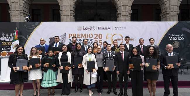 La Presidenta entregó el Premio Nacional de Deportes 2025: en deporte no profesional a Andrea Maya Becerra Arizaga de Tiro con arco; Alegna Aryday González Muñoz de Atletismo; Uziel Aarón Muñoz Galarza de Atletismo y Osmar Olvera Ibarra de Clavados. En deporte profesional a Isaac Del Toro Romero de Ciclismo. En deporte paralímpico a Luis Carlos López Valenzuela de Paratletismo y Osiris Aneth Machado Plata de Paratletismo.