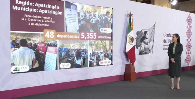 La secretaria de Gobernación, Rosa Isela Rodríguez Velázquez, informó que, durante diciembre se realizarán 13 Ferias del Bienestar, una en cada región de la entidad, de las que, del 9 de noviembre al 9 de diciembre, se han llevado a cabo siete otorgando un total de 74 mil 236 atenciones. Además, se implementarán cuatro jornadas de Sí al Desarme, Sí a la Paz, así como un Tianguis del Bienestar en las que participarán 53 dependencias del Gobierno de México, del gobierno del estado y autoridades municipales.