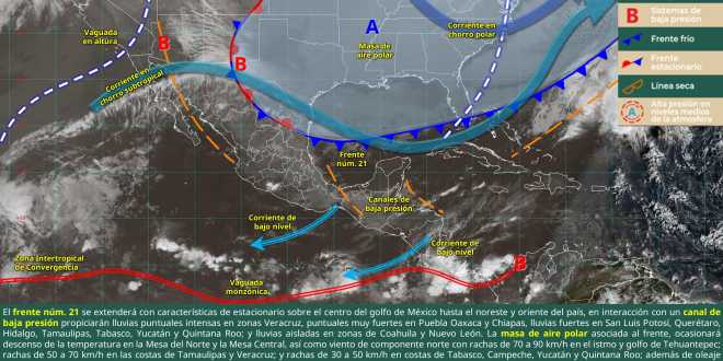 Las precipitaciones mencionadas serán originadas por el frente número 21 que se extenderá con características de estacionario sobre el centro del golfo de México hasta el noreste y oriente del país, un canal de baja presión sobre el sureste mexicano y el ingreso de aire húmedo del océano Pacífico.