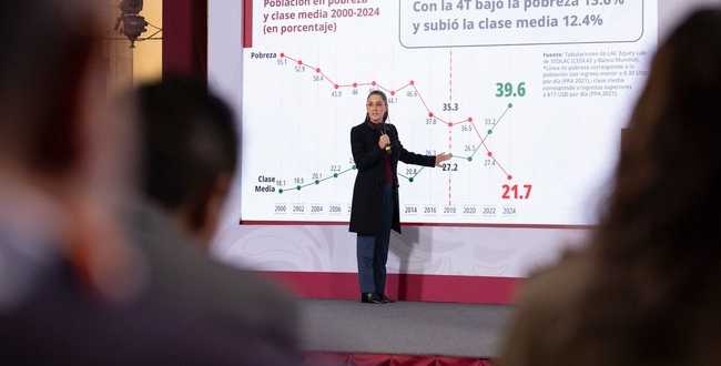 La Presidenta Claudia Sheinbaum Pardo resaltó que México, con la Cuarta Transformación, es el país de América Latina donde creció más la clase media, ya que incrementó 12.4 por ciento, de acuerdo con datos del Banco Mundial, al pasar de 27.2 por ciento en 2018 a 39.6 por ciento en 2024; el objetivo, señaló, es que siga la tendencia de aumento.