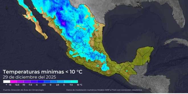 Para el lunes 29 de diciembre se pronostican lluvias muy fuertes a puntuales intensas (75 a 150 mm): Veracruz (Huasteca Baja, Totonaca, Nautla, Papaloapan, Los Tuxtlas y Olmeca); Puebla (Sierra Norte y Sierra Nororiental); Tamaulipas; Oaxaca; Chiapas y Tabasco. Y temperaturas mínimas de -10 a -5 °C con heladas en zonas serranas de Baja California, Sonora, Chihuahua y Durango.