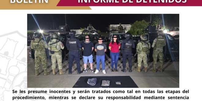 Los elementos de las fuerzas estatales y federales llevaron a cabo las acciones operativas en las inmediaciones de la calle General Ignacio Zaragoza, esquina con calle Venustiano Carranza, en la colonia Centro, del municipio de Centro y como resultado del despliegue operativo fueron detenidos Denis «N», de 34 años de edad, alias “El Chelo” y/o “Rezongón”; Ana «N», de 34 años de edad, alias “La Tatuada”; y Juan «N», de 25 años de edad, alias “El Capibara”, “Chaparro” y/o “Máyate”, quienes fueron puestos a disposición de la autoridad competente para el seguimiento legal correspondiente.