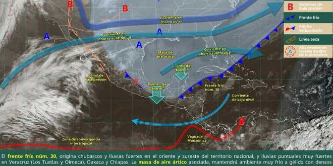 Tabasco y Campeche; intervalos de chubascos (de 5 a 25 mm) en Puebla (Tehuacán-Sierra