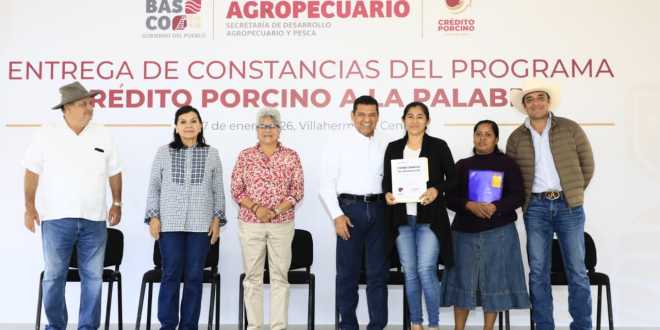 El Gobernador Javier May Rodríguez puso en marcha el programa Crédito Porcino a la Palabra, con la entrega de constancias a las primeras 110 beneficiarias de 11 comunidades de Centro, en cuyo marco resaltó que estas acciones fortalecen el sector pecuario para generar oportunidades reales a las comunidades, reduciendo las desigualdades e incentivando una economía más justa, más incluyente y con raíces en la tierra.