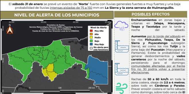 Ante el posible ingreso del Frente Frío No. 31, el Instituto de Protección Civil del Estado de Tabasco (IPCET), emite Alerta Amarilla ante la previsión de condiciones meteorológicas adversas durante el fin de semana, principalmente el sábado 31 de enero, las cuales podrían provocar incrementos en los niveles de ríos serranos, encharcamientos y afectaciones en zonas vulnerables del estado.