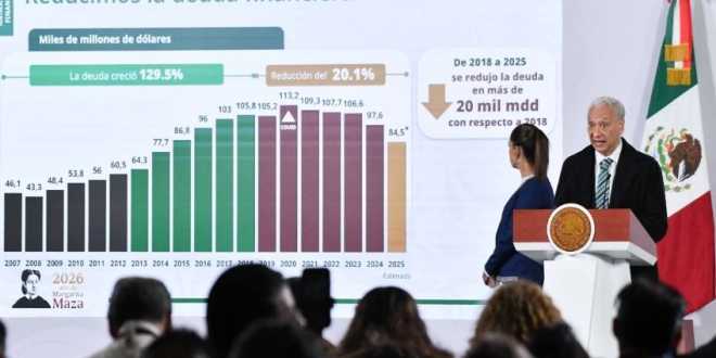 La deuda de Petróleos Mexicanos (Pemex) disminuyó en 20 por ciento durante 2025 gracias a los instrumentos financieros que se implementaron en conjunto con la Secretaría de Hacienda y Crédito Público, informó Luz Elena González Escobar, secretaria de Energía.