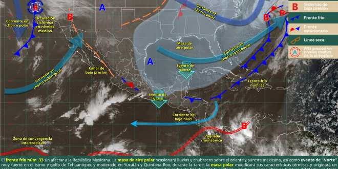 frente frío número 33 que cubrirá el noreste, centro, oriente y sureste de México,