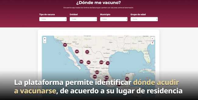 La Secretaría de Salud puso en operación la plataforma digital https://dondemevacuno.salud.gob.mx, una herramienta que permite a la población consultar de manera rápida y sencilla si forma parte del grupo prioritario para vacunación contra el sarampión y localizar el punto de vacunación más cercano.
