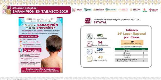 Asimismo, el secretario de Salud estatal resaltó el trabajo en conjunto realizado entre el ISSET, IMSS ordinario, IMSS-Bienestar, ISSSTE, Marina y Defensa; destacó que ha servido para que Tabasco se encuentre actualmente en el lugar 14 nacional de casos registrados positivos con 54, siendo el municipio de Centro el registra el mayor número registrados.