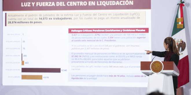 La secretaria Anticorrupción y de Buen Gobierno, Raquel Buenrostro Sánchez, detalló que entre las pensiones exorbitantes entre personal de confianza destacan: Luz y Fuerza del Centro en Liquidación con 9 mil 457 extrabajadores que reciben una pensión de 100 mil a 1 millón de pesos, de los cuales, 3 mil 504 tienen una jubilación mayor al sueldo neto mensual de la Presidenta.